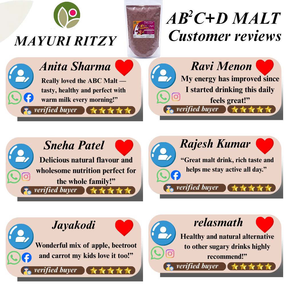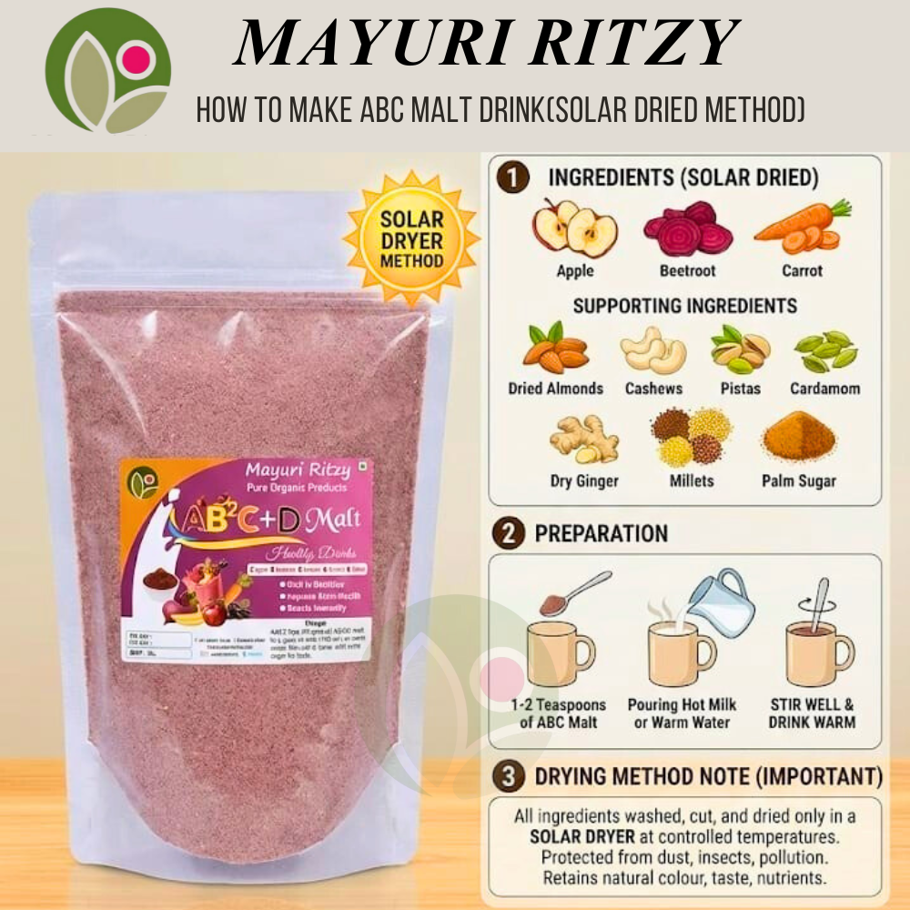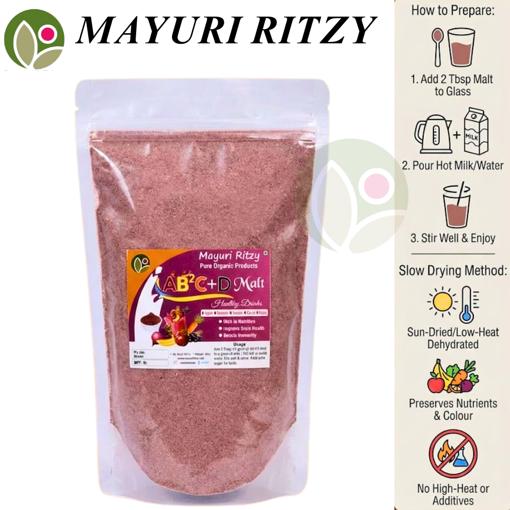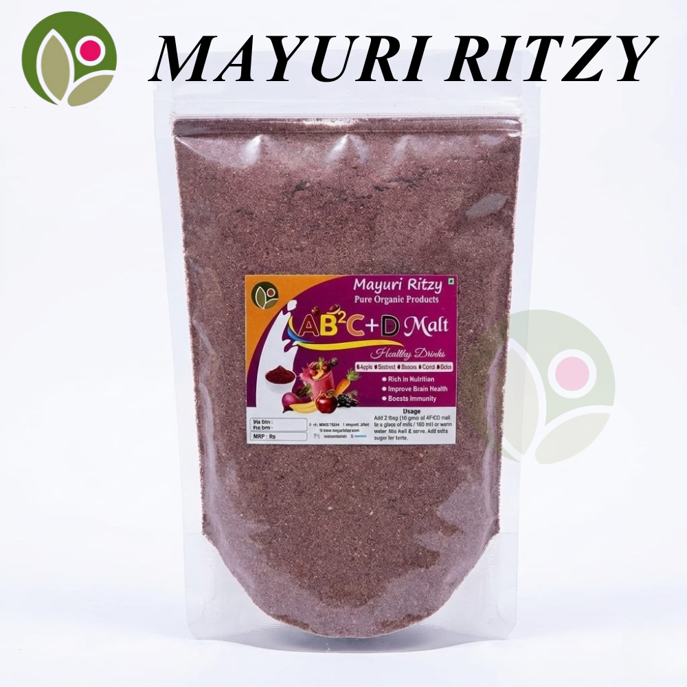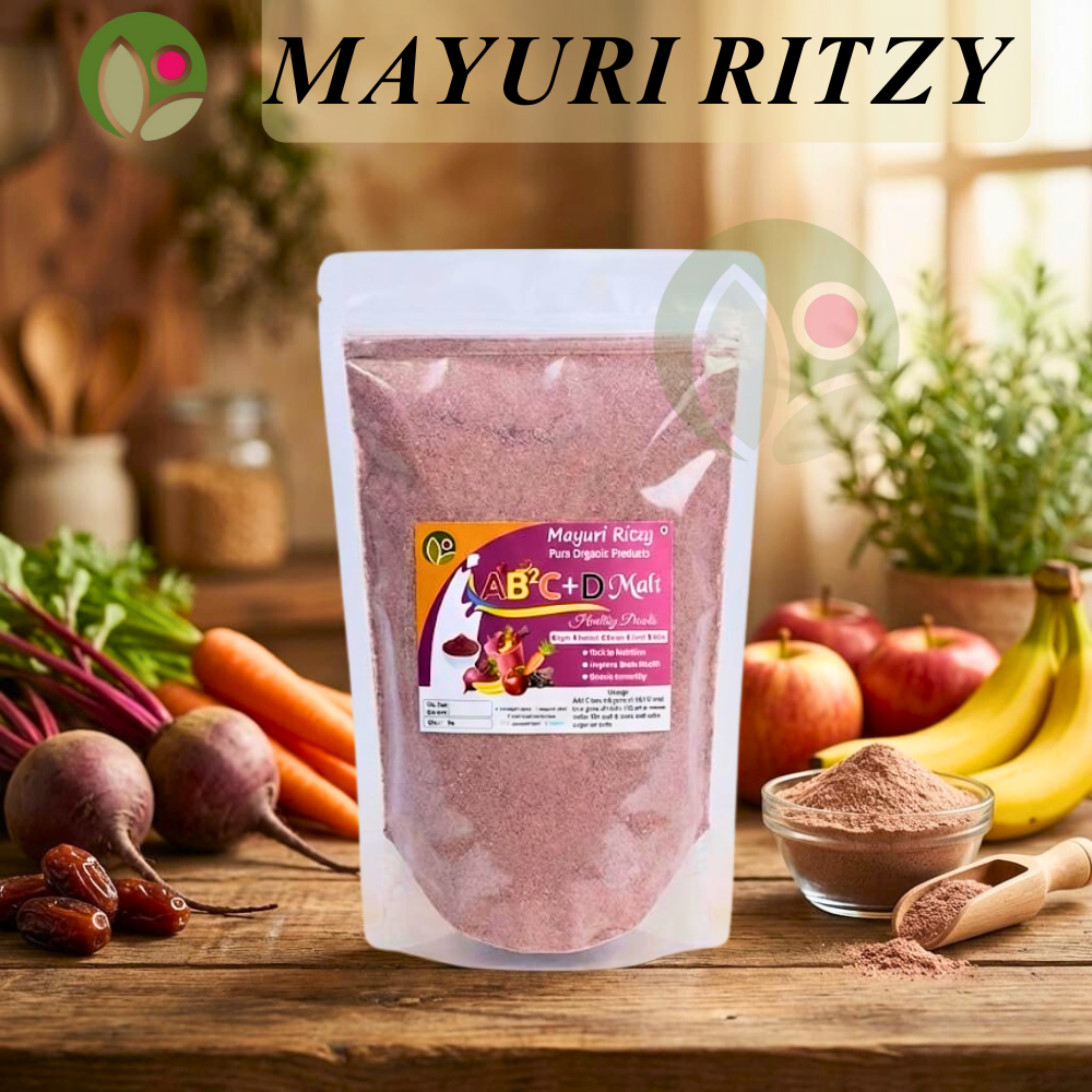 Mayuri Ritzy ABC+D Malt is a nutritious health drink made from the natural goodness of Apple, Beetroot, Carrot, and Dates. This vitality-boosting malt helps improve daily energy levels, supports immunity, and promotes overall wellness for both children and adults. Carefully prepared using quality ingredients, it provides essential nutrients in a tasty and easy-to-consume form. Simply mix with warm milk or water for a healthy, refreshing drink. Free from harmful chemicals and artificial additives, ABC+D Malt is ideal for daily consumption to stay active, energetic, and refreshed throughout the day.