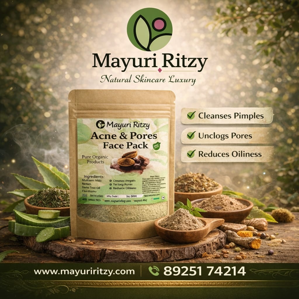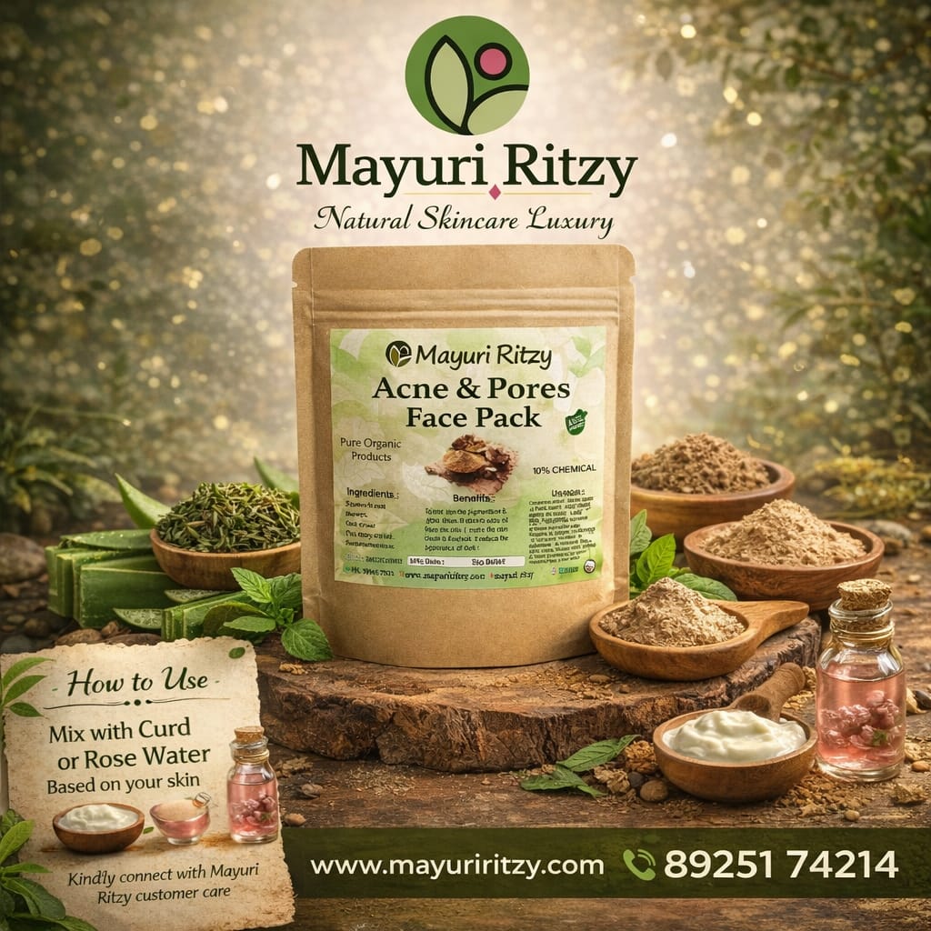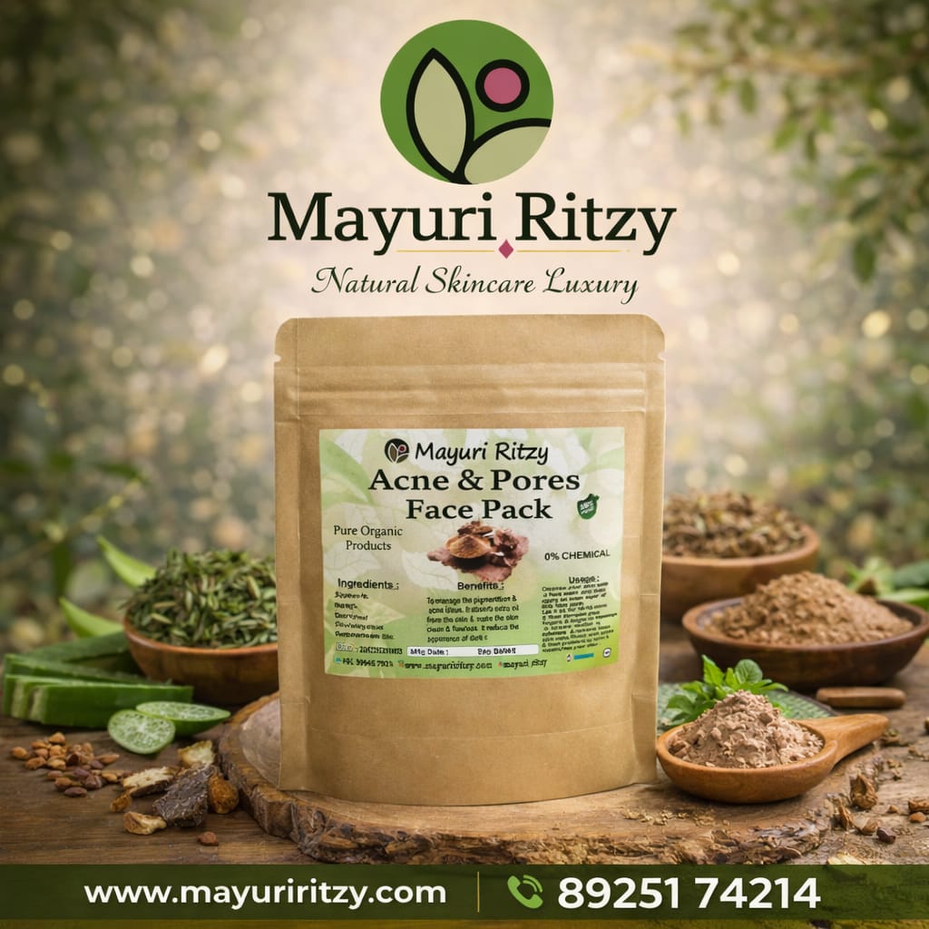 Mayuri Ritzy Acne & Pore Face Pack is a natural skincare formula designed to help reduce acne, control excess oil, and minimize the appearance of pores. It deeply cleanses the skin, removes impurities, and leaves your face fresh, smooth, and clear.