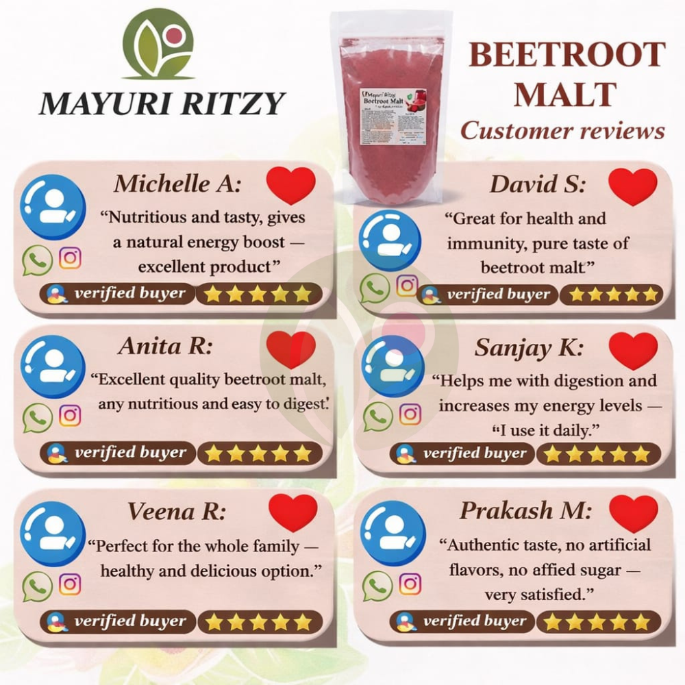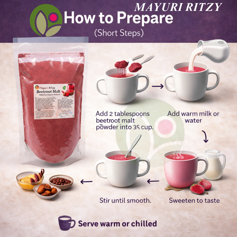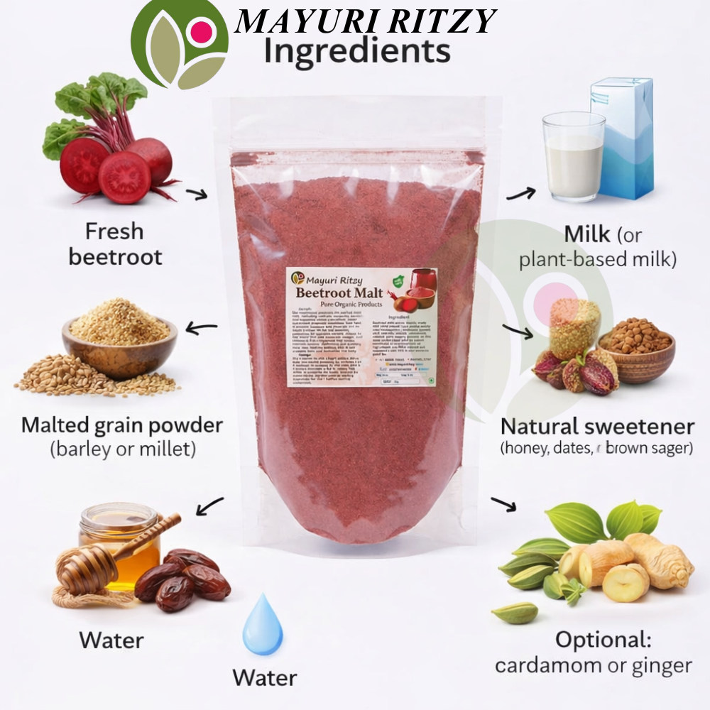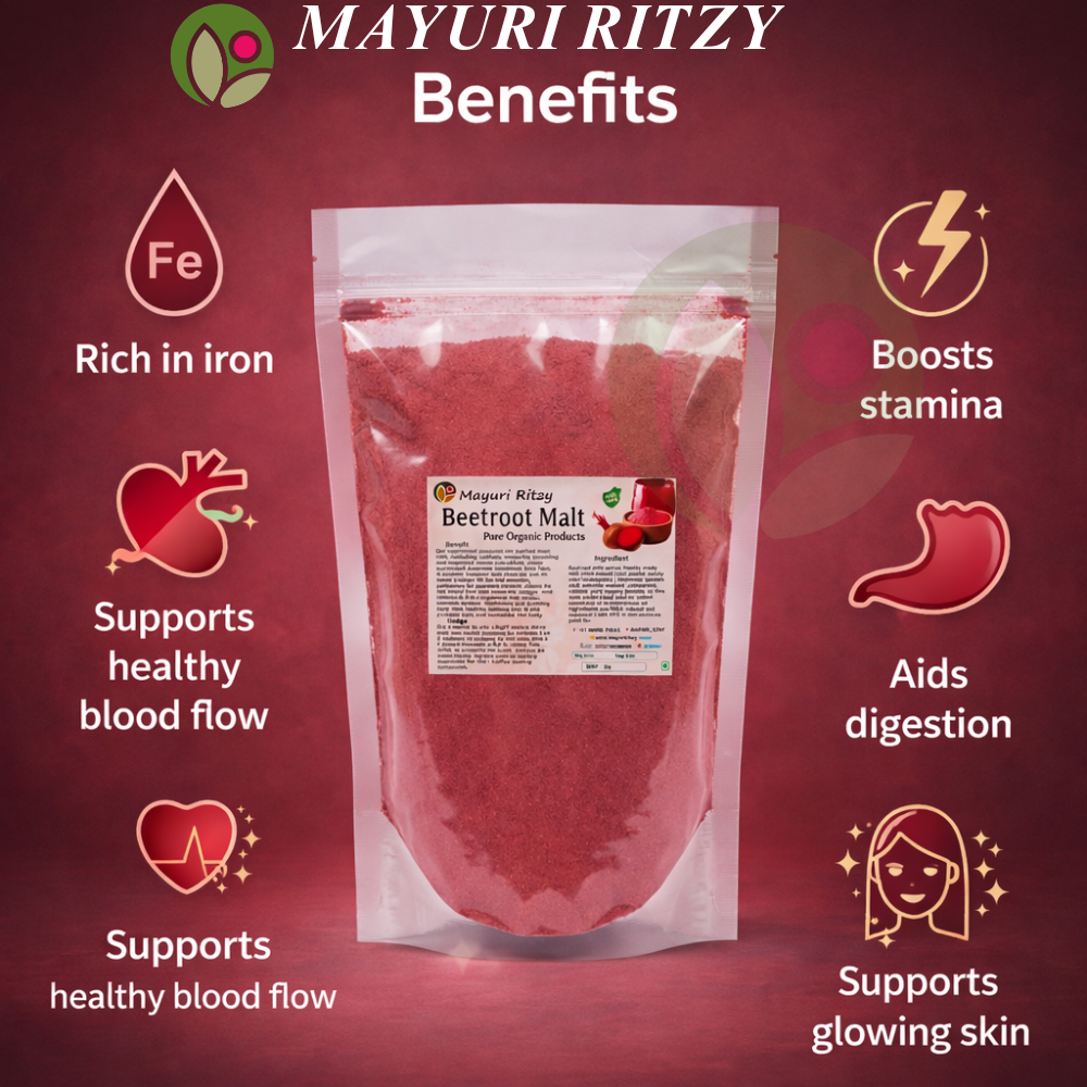 Mayuri Ritzy Beetroot Malt is a pure and natural health mix packed with essential nutrients. It helps boost energy, support healthy blood levels, and improve overall wellness. Made with natural ingredients, it is a healthy addition to your daily diet.