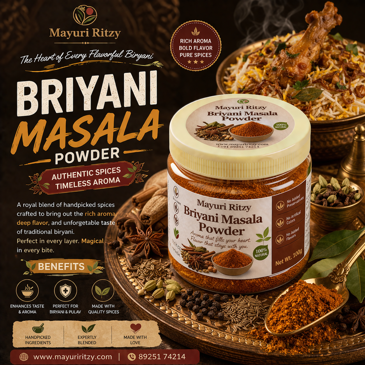 Mayuri Ritzy Biryani Masala Powder is a rich and aromatic blend of premium spices crafted to give authentic biryani flavor. It enhances the taste, aroma, and color of your biryani, making every meal special and delicious.