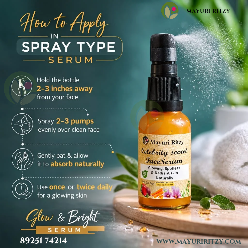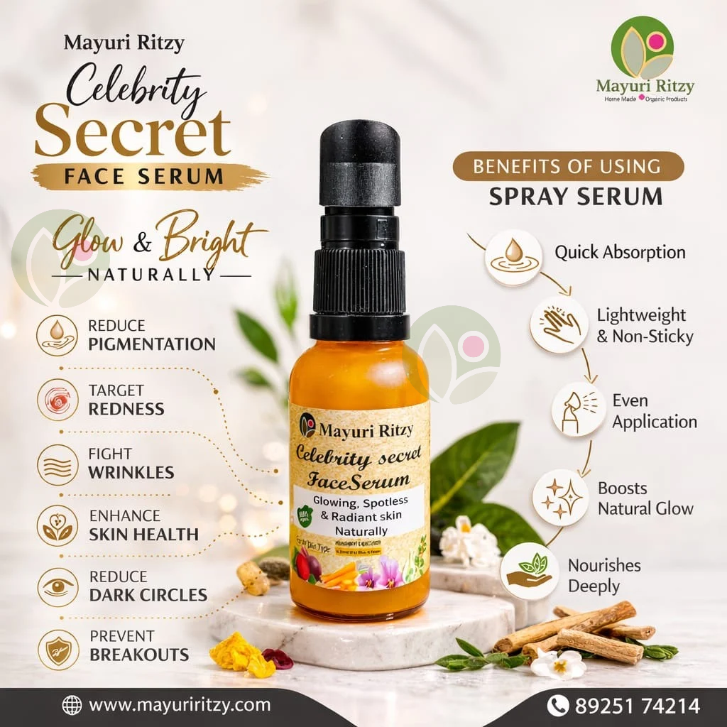 Mayuri Ritzy Celebrity Secret Face Serum is a premium skincare formula designed to enhance your skin’s natural glow and beauty. It helps nourish the skin, improve brightness, and support a smooth, radiant complexion.