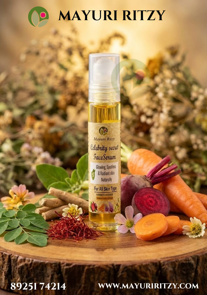 Mayuri Ritzy Celebrity Secret Face Serum is a natural skincare formula designed to give glowing, spotless, and radiant skin. Enriched with herbal ingredients, it helps nourish the skin, reduce dullness, and improve natural brightness.