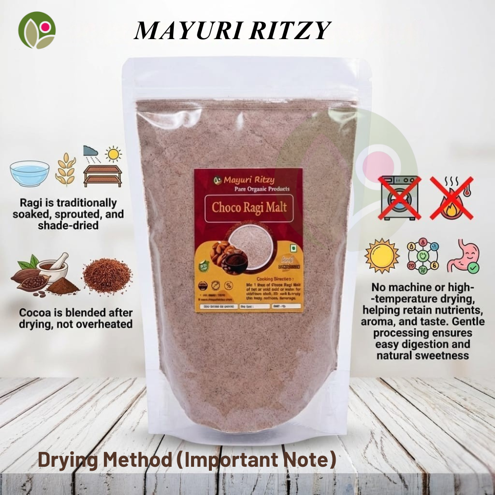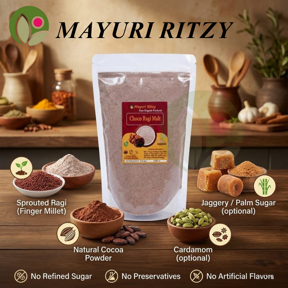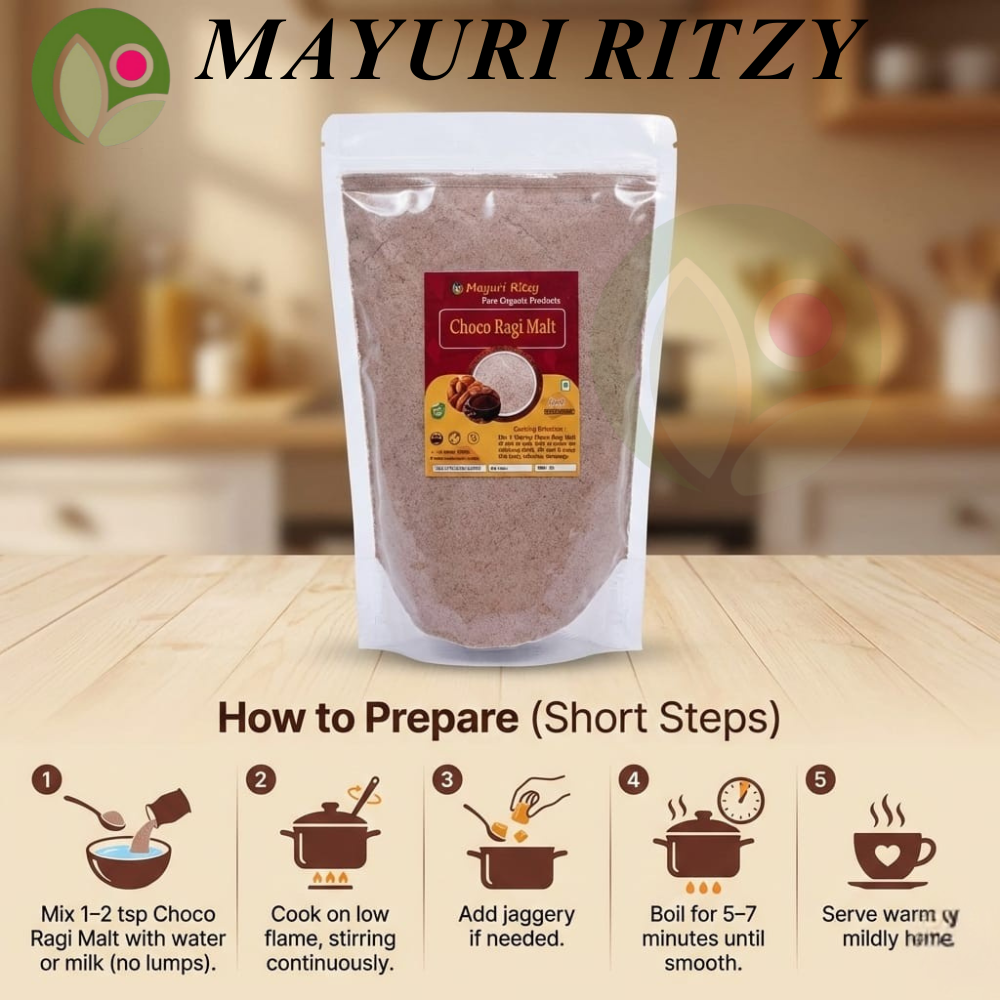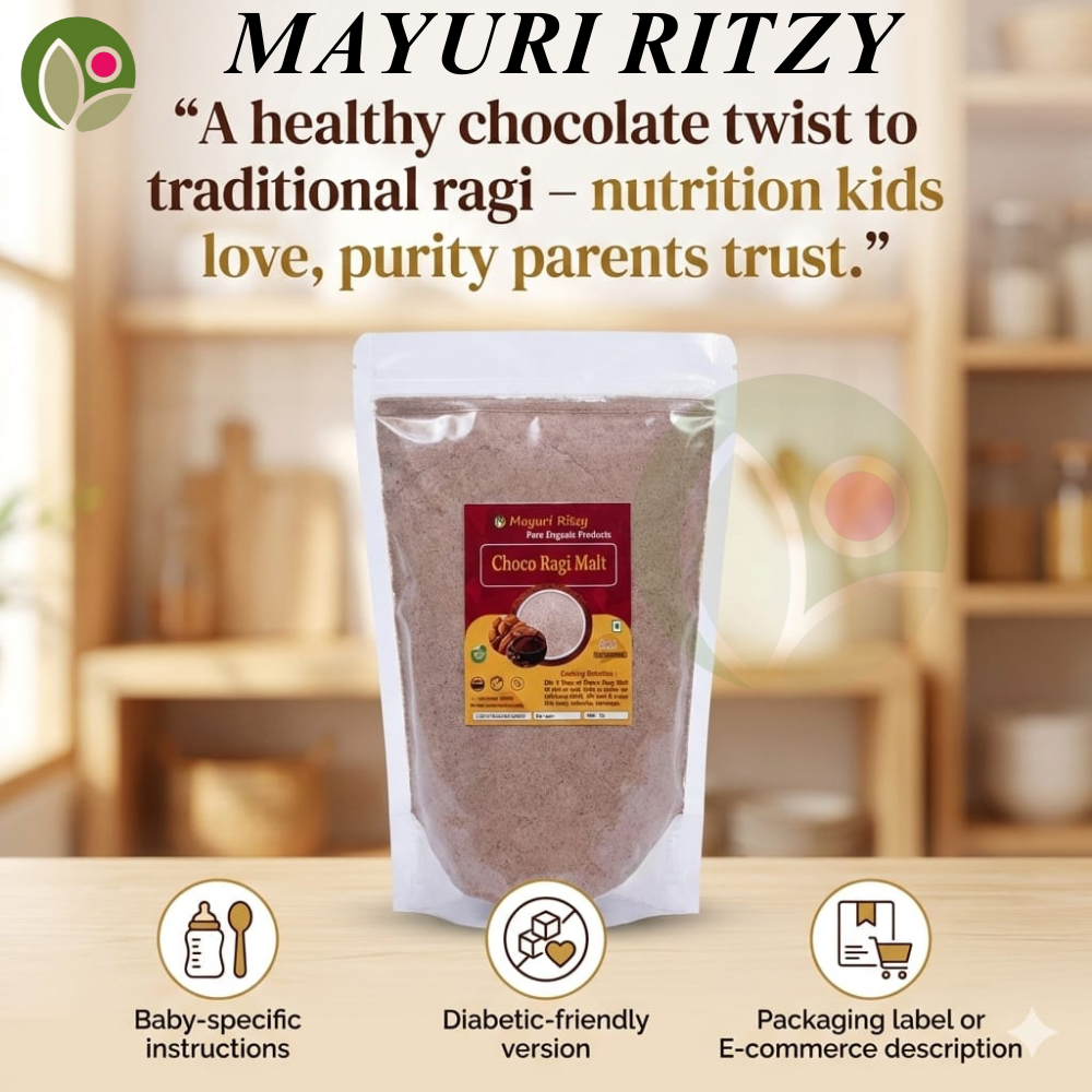 Mayuri Ritzy Choco Ragi Malt is a delicious and nutritious health drink made from high-quality ragi blended with natural cocoa flavor. Rich in calcium, iron, protein, and dietary fiber, it helps support strong bones, sustained energy, and healthy digestion. The chocolate taste makes it kid-friendly while remaining free from refined sugar and harmful additives. Naturally gluten-free and easy to digest, this wholesome malt keeps you full for longer, making it ideal for breakfast or an evening drink. Suitable for children and adults, Mayuri Ritzy Choco Ragi Malt is perfect for daily nutrition, immunity support, and overall well-being.