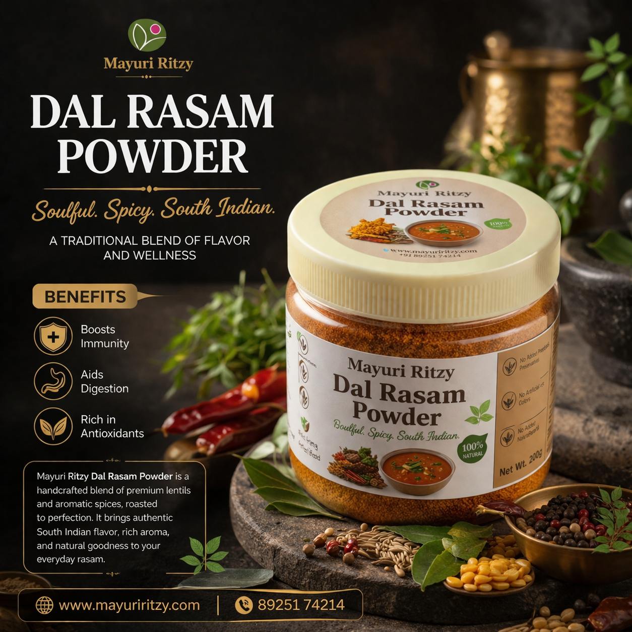 Mayuri Ritzy Dal Rasam Powder is a traditional spice blend crafted to prepare flavorful and aromatic rasam. Made with natural ingredients, it adds a perfect balance of taste and health to your meals.
