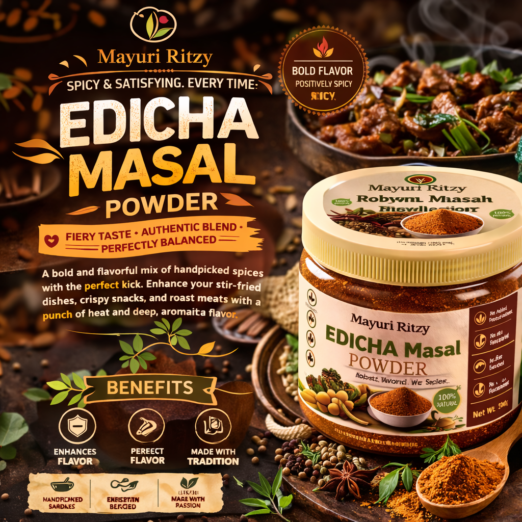 Mayuri Ritzy Edicha Masala Powder is a traditional hand-pounded spice blend made with carefully selected natural ingredients. It delivers a rich aroma and authentic homemade taste, enhancing the flavor of your curries and gravies.