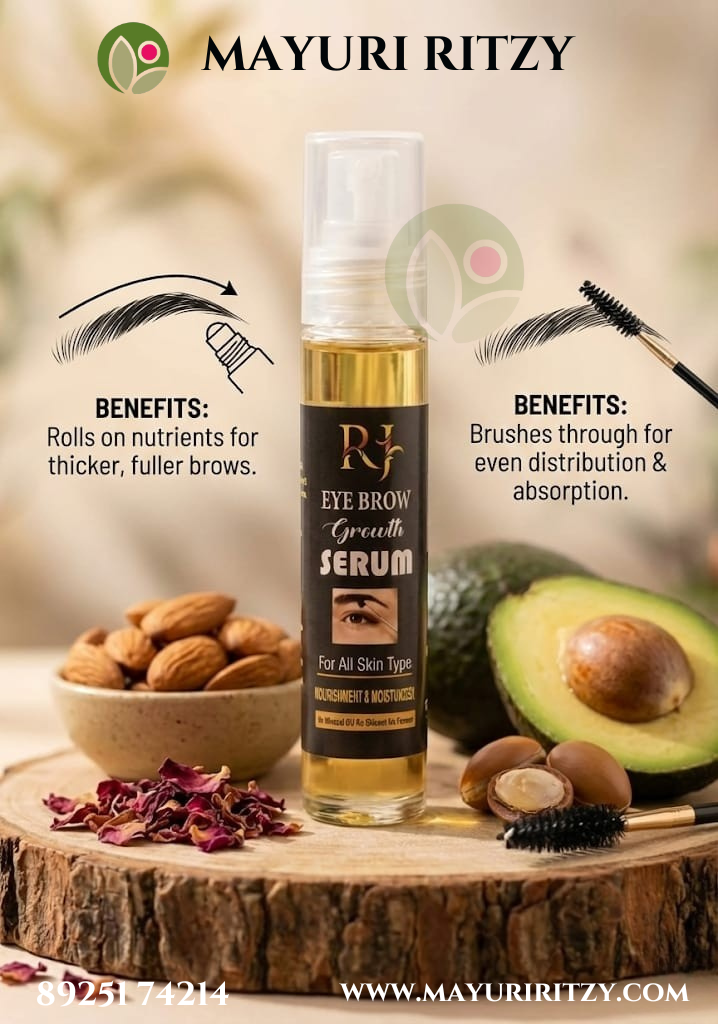 Mayuri Ritzy Eyebrow Growth Serum is a natural formula designed to support thicker, fuller, and healthier-looking eyebrows. It helps nourish the hair roots and improve the appearance of thin or sparse brows with regular use.