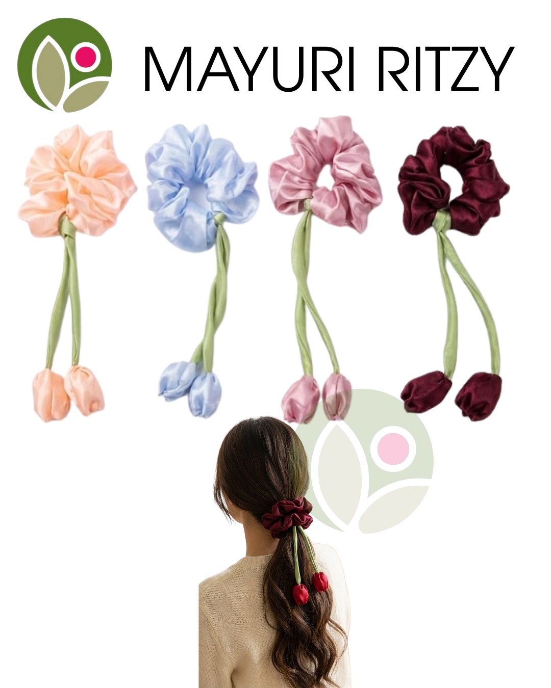 Satin scrunchies designed with elegant flower stems for a unique, statement hairstyle. Soft, secure, and perfect for adding a charming floral touch to everyday or festive looks.