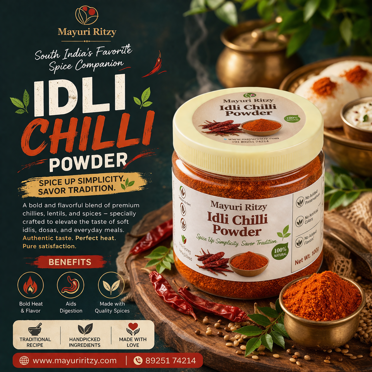 Mayuri Ritzy Idli Chilli Powder is a traditional and flavorful spice blend made with quality ingredients. It adds a rich, spicy taste to idli, dosa, and other tiffin items, making your meals more delicious.