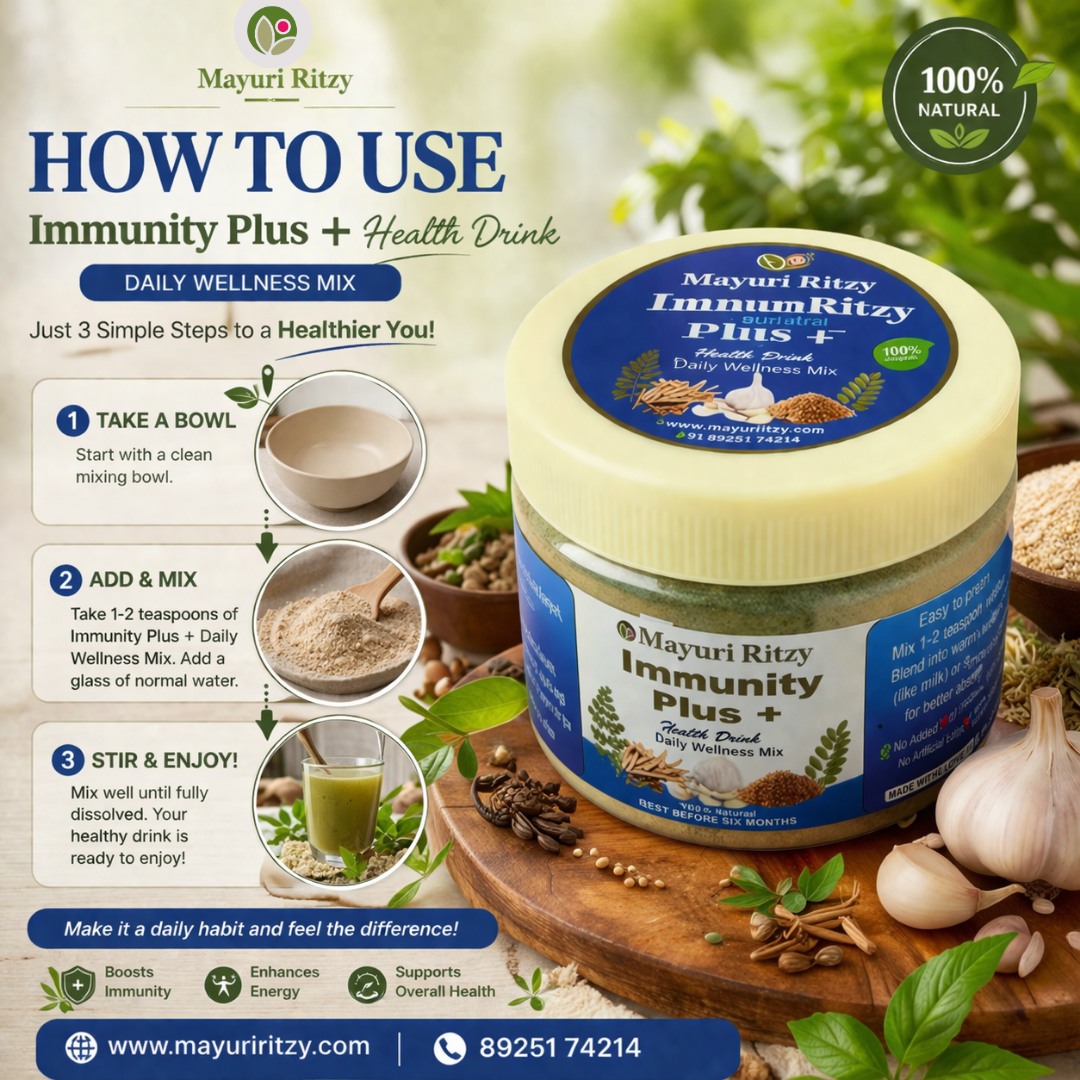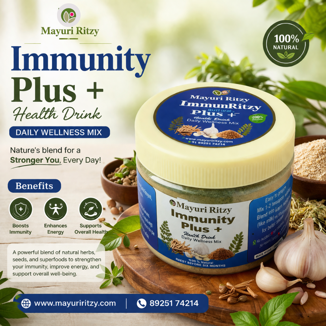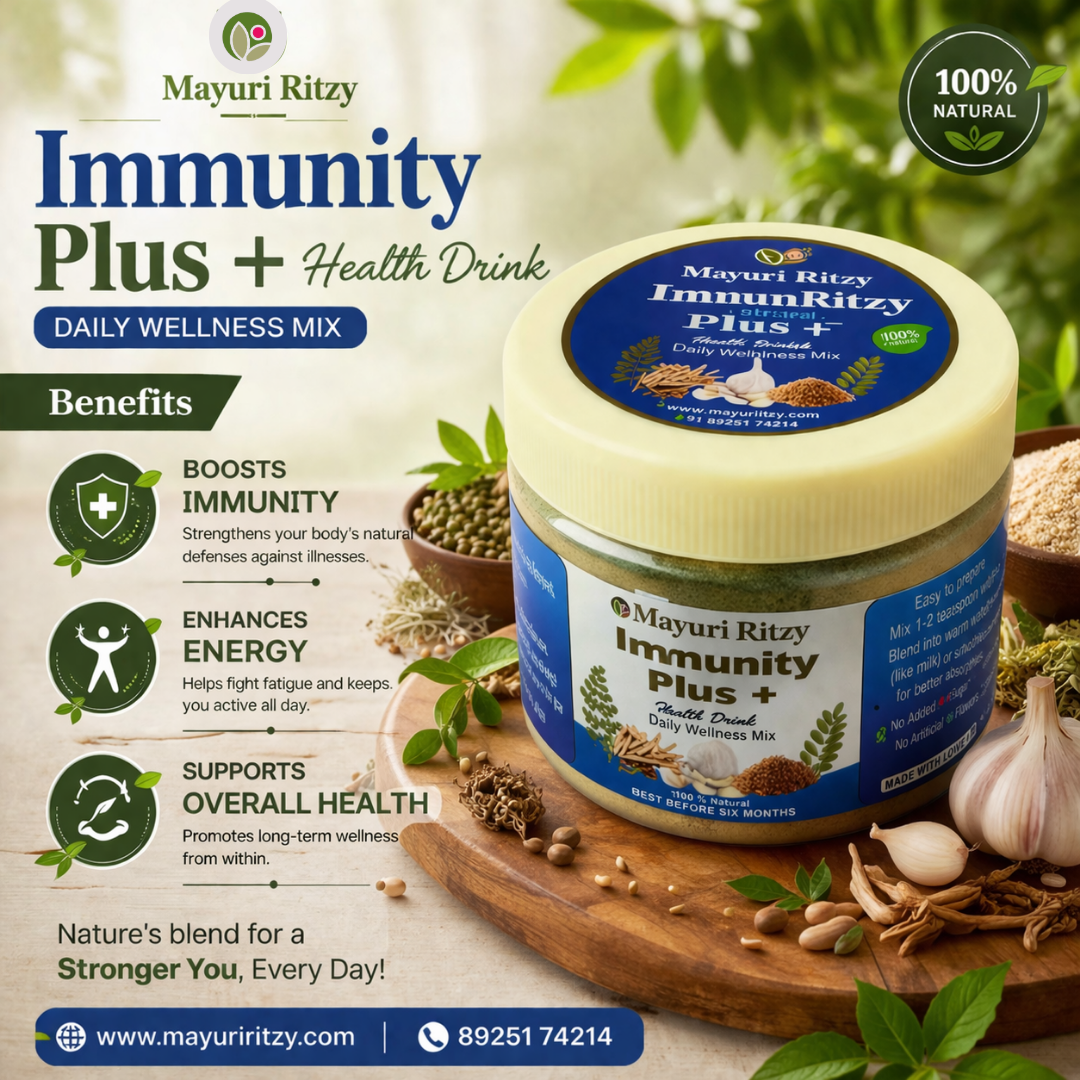 Mayuri Ritzy Immunity Plus+ Powder is a natural health blend designed to support your body’s immune system and overall wellness. Made with carefully selected ingredients, it helps boost energy, improve strength, and maintain daily health.
