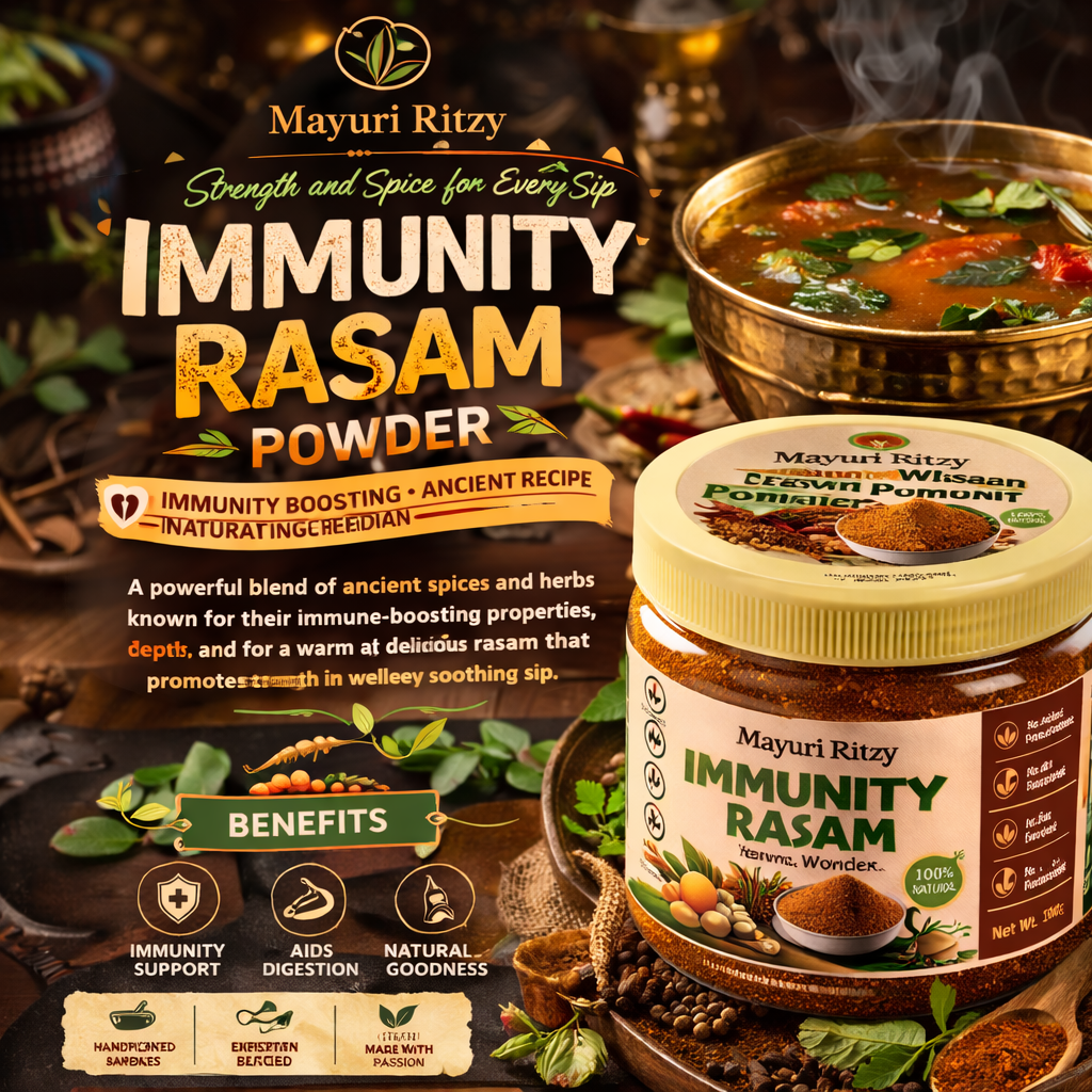Mayuri Ritzy Immunity Rasam Powder is a traditional herbal spice blend made with natural ingredients to support immunity and overall wellness. It adds a rich, aromatic flavor to rasam while helping keep you healthy and refreshed.