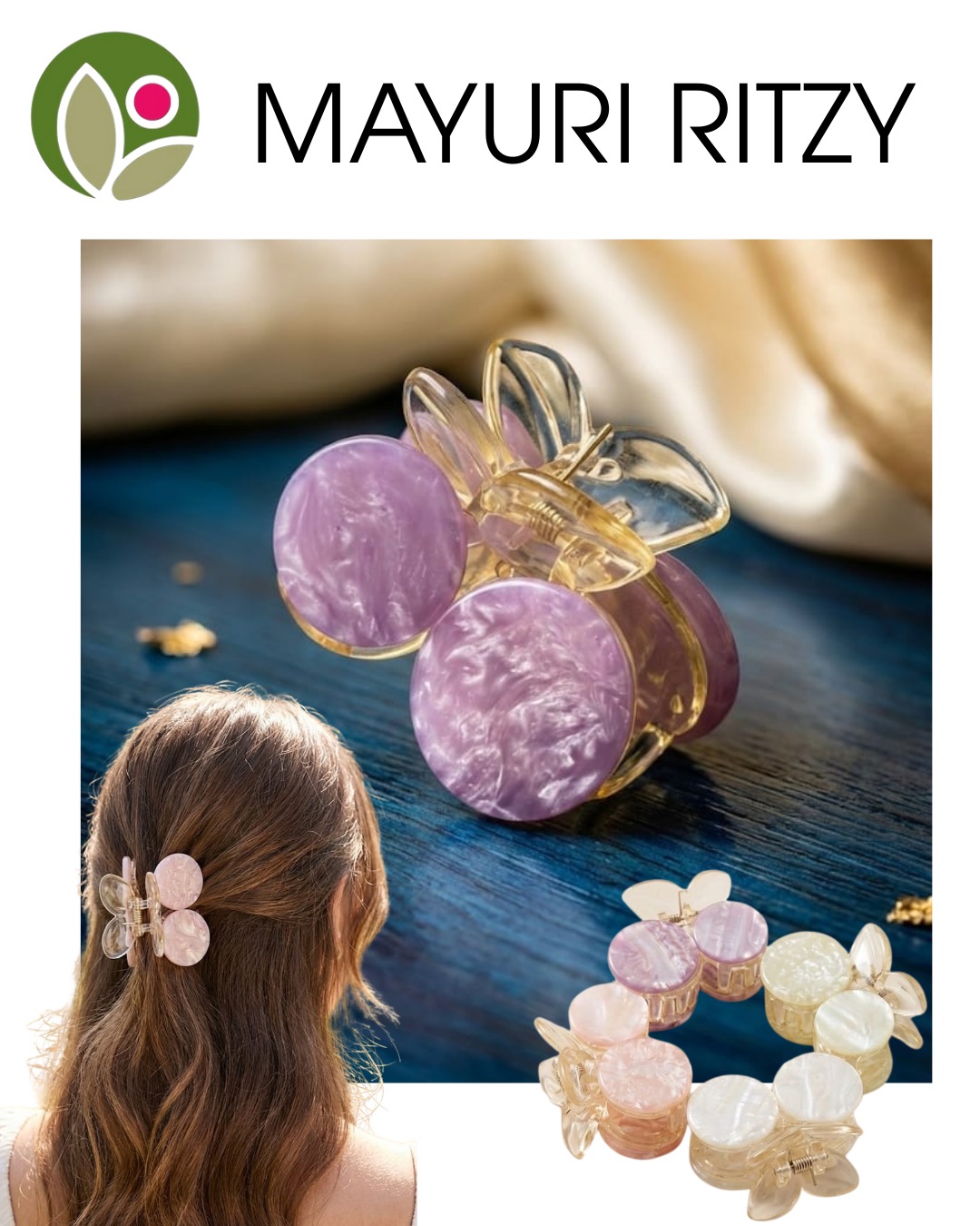 Elegant butterfly hair claw clips featuring glossy marble-finish discs for a soft, luxurious look. Lightweight yet secure, perfect for everyday styling and graceful occasions.
