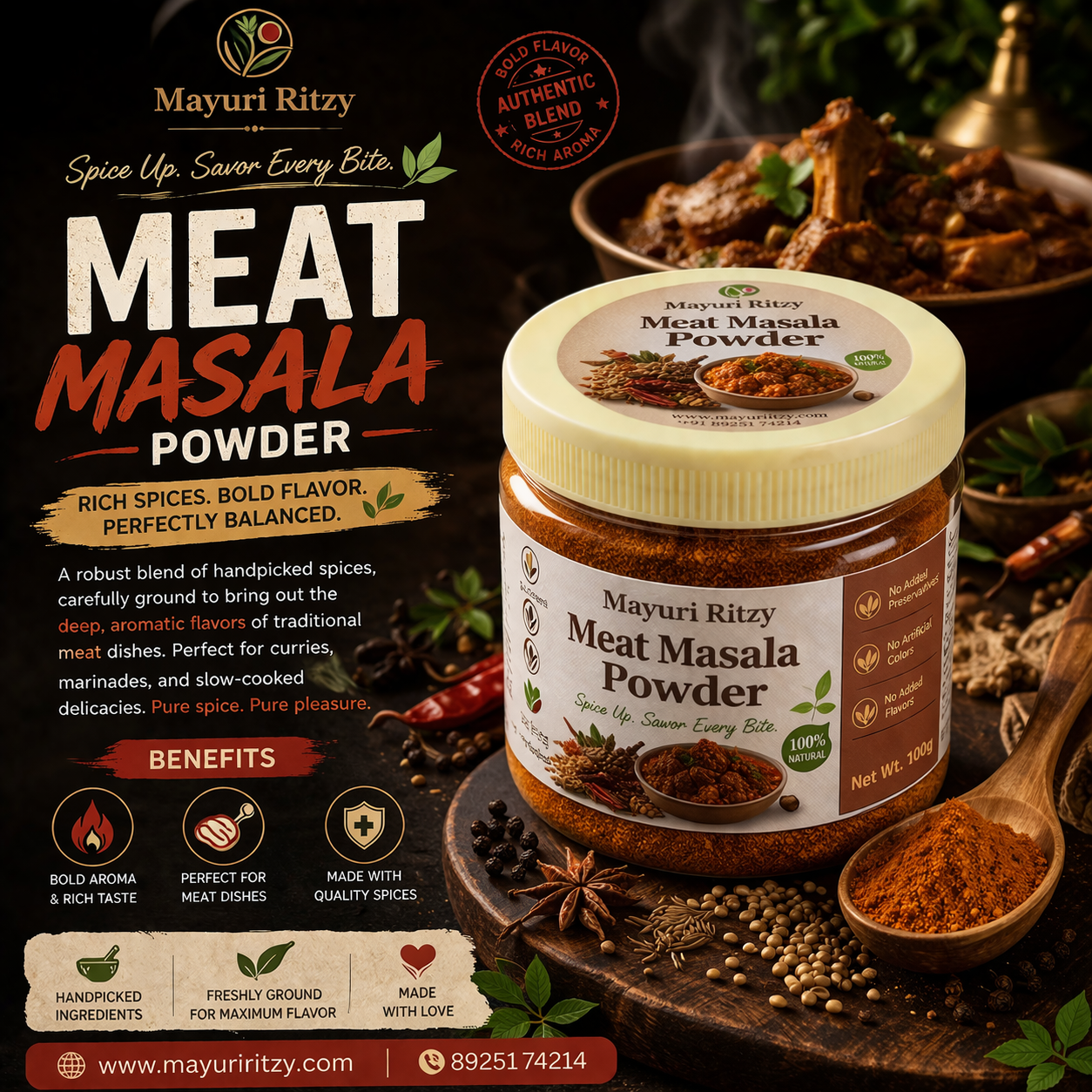 Mayuri Ritzy Meat Masala Powder is a rich and aromatic spice blend specially crafted to enhance the taste of meat dishes. Made with quality spices, it adds depth, flavor, and a delicious aroma to your cooking.