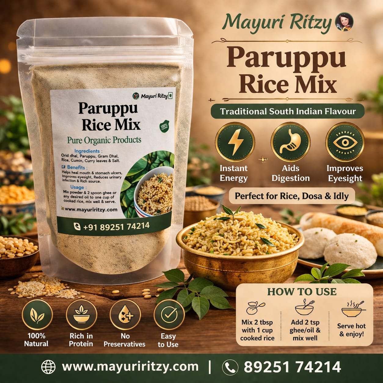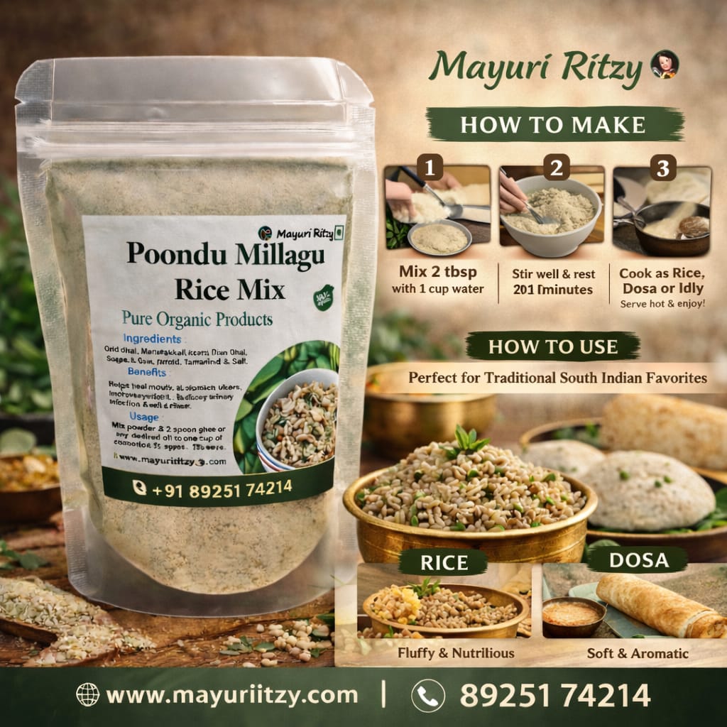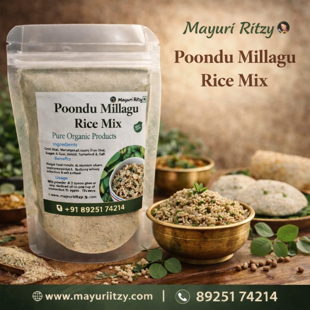 Mayuri Ritzy Poondu Milagu Rice Mix is a traditional and flavorful blend made with garlic (poondu) and pepper (milagu). It adds a rich, spicy taste to your rice while supporting overall health and digestion.