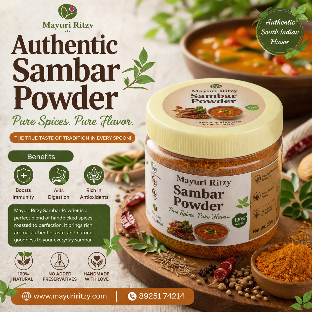 Mayuri Ritzy Sambar Powder is a traditional spice blend made with high-quality ingredients to give rich aroma and authentic taste to your sambar. It enhances the flavor of your dishes and makes everyday cooking easy and delicious.