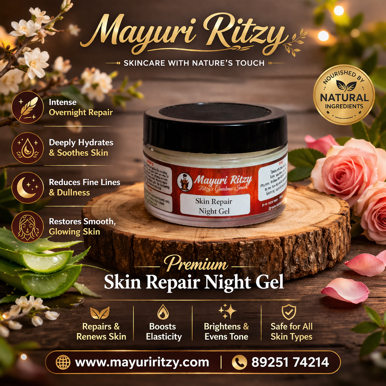 Indulge in the richness of Wine, Coffee, Gel, Essential Oil, and more with our Skin Repair Night Gel for Glowing Skin. Ideal for both Women and Men.