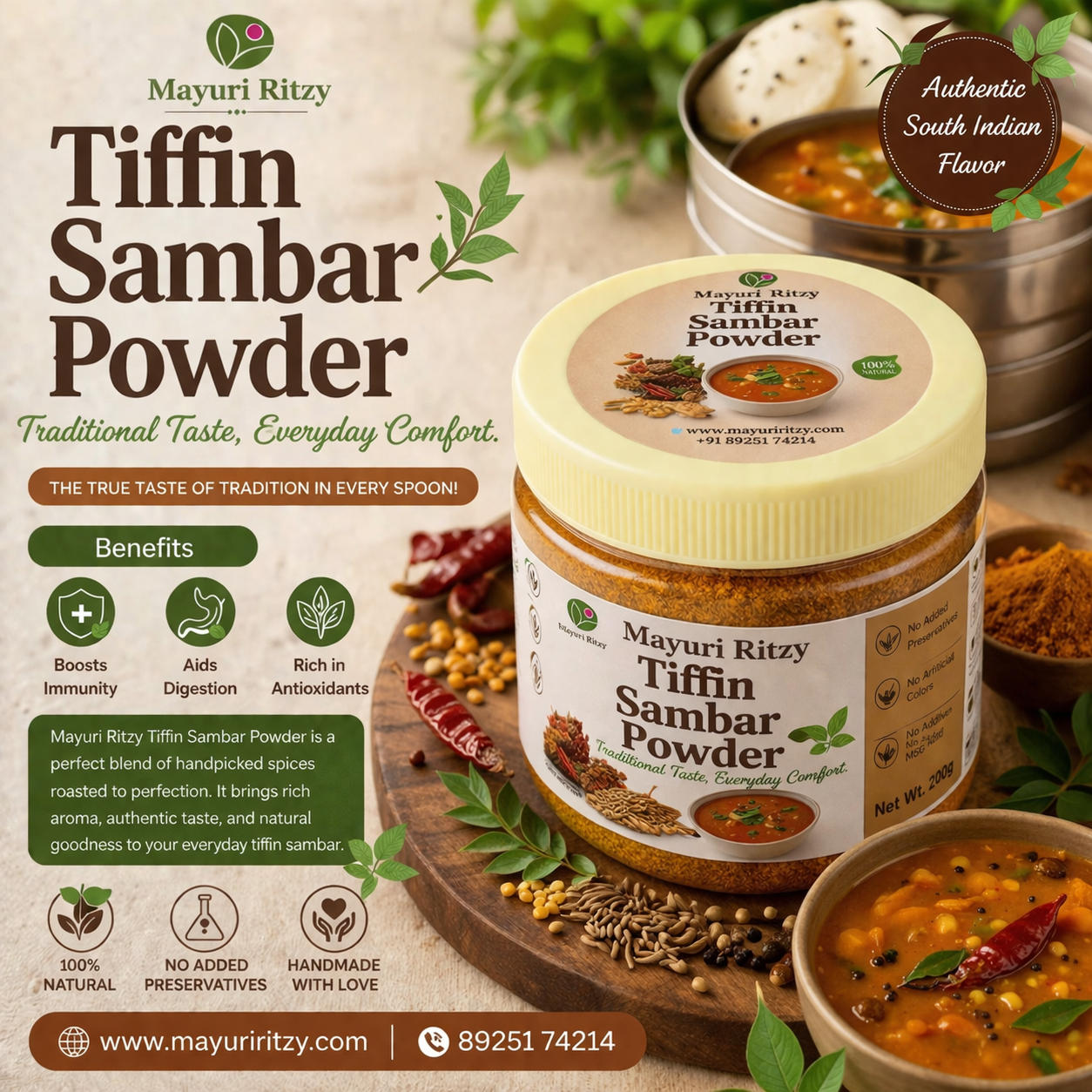 Mayuri Ritzy Tiffin Sambar Powder is a special blend of spices crafted to give a delicious and mild flavor, perfect for tiffin items like idly, dosa, pongal, and vada. It enhances taste with a rich aroma and authentic homemade touch.